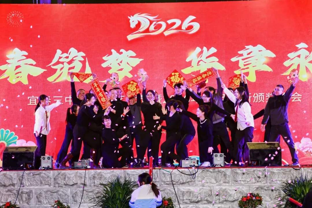 夜幕渐深,暖意融融。当器乐合奏《诀别书》的悠扬旋律落下帷幕,整场晚会在温馨与感动中圆满结束。此次元旦迎新颁奖晚会,不仅是一场艺术的盛宴,更是一次精神的凝聚。2026 年,宜春三中全体师生将心怀热爱、奔赴山海,以昂扬奋斗的姿态,奋力谱写大成教育的崭新篇章,策马奔腾向未来!