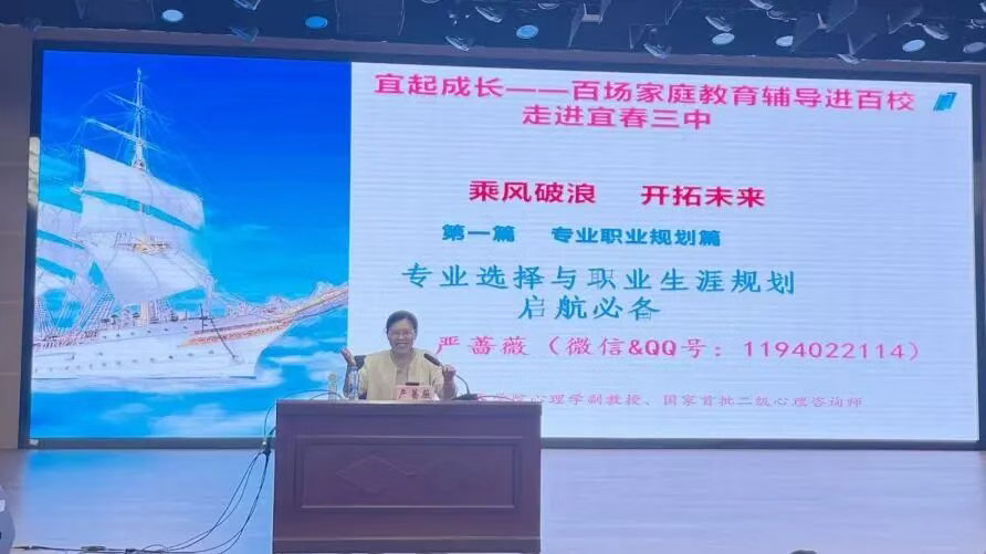 为进一步加强家校共育,帮助学生从被动学习转向主动成长,提前建立“学业-职业-人生”的关联认知,避免未来选择的盲目性,同时让家长成为孩子的“支持者与引导者”,而非“决策者”,帮助孩子在探索中找到适合自己的方向,9月19日下午4点,“宜起成长”百场家庭教育辅导活动走进宜春三中。本次活动特邀宜春学院教育心理学副教授、国家二级心理咨询师严蔷薇老师为同学们带来了一场题为“乘风破浪,开拓未来”的专题讲座,现场座无虚席,反响热烈。